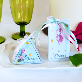 Nossas caixas de papel personalizáveis podem ser utilizadas para decorar a mesa de festa. Pode ainda colocar em seu interior pequenas lembranças como bombom, ou outra lembrança pequena (não inclui fita).